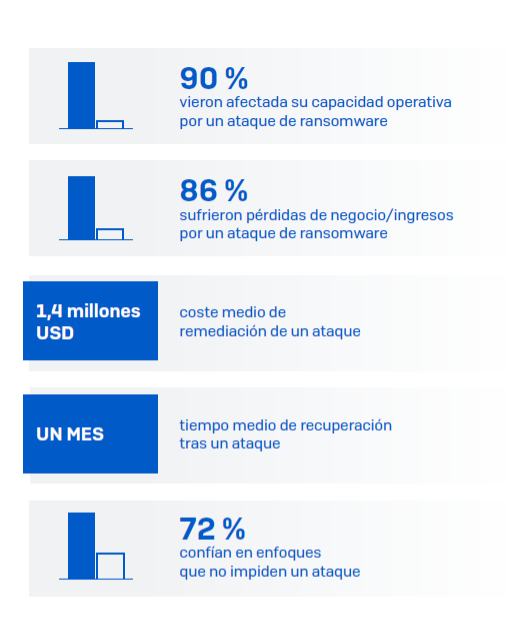 El impacto económico no solo se ciñe al rescate que paga una empresa, también debemos de sumarle el coste que supone que su actividad se quede afectada por el cifrado del activo más importante que tienen las compañías que es la información. También debemos sumarle el tiempo que estamos trabajando de forma degradada hasta que conseguimos recuperar nuestra actividad de forma normal. Según el informe publicado por Sophos el tiempo medio de recuperación ante un ciberataque tipo ransomware es de un mes.